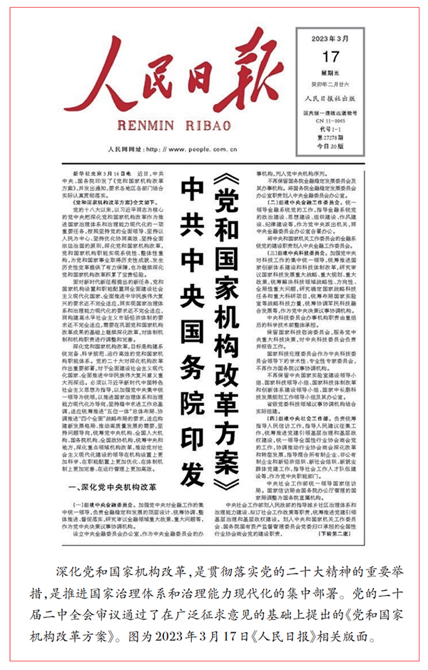 2023年2月,黨的二十屆二中全會審議通過《黨和國家機(jī)構(gòu)改革方案》,推動黨對社會主義現(xiàn)代化建設(shè)的領(lǐng)導(dǎo)在機(jī)構(gòu)設(shè)置上更加科學(xué)、在職能配置上更加優(yōu)化、在體制機(jī)制上更加完善、在運(yùn)行管理上更加高效。
