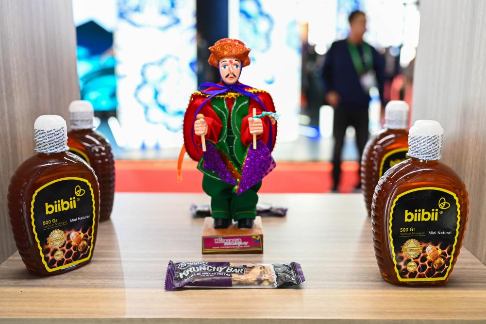 2023年11月8日在第六屆進(jìn)博會(huì)上拍攝的尼加拉瓜蜂蜜產(chǎn)品。
