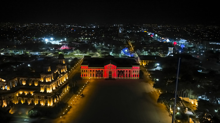 2022年1月31日,尼加拉瓜首都馬那瓜市中心標(biāo)志性建筑國(guó)家宮點(diǎn)亮“中國(guó)紅”(無(wú)人機(jī)照片)。