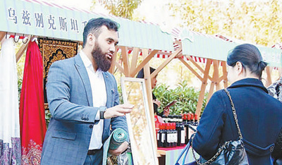 阿森貝克(左)在一場(chǎng)校園活動(dòng)中介紹烏茲別克斯坦手工藝品。浙江大學(xué)管理學(xué)院供圖