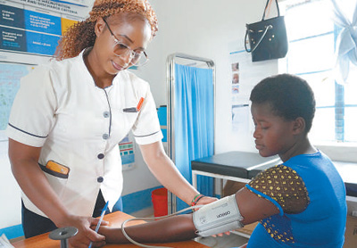 穆薩烏(左)為一名當(dāng)?shù)卦袐D測(cè)量血壓。人民日?qǐng)?bào)記者 黃煒鑫攝