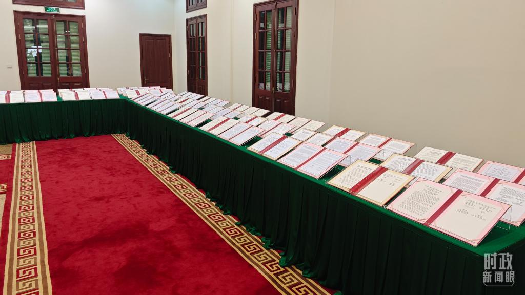 △ 2023年12月,習(xí)近平主席抵達(dá)越南河內(nèi),開啟年內(nèi)的第四次出訪。圖為中越雙方簽署的雙邊合作文件展示,涵蓋共建“一帶一路”等30多個領(lǐng)域。(總臺央視記者耿小龍拍攝)