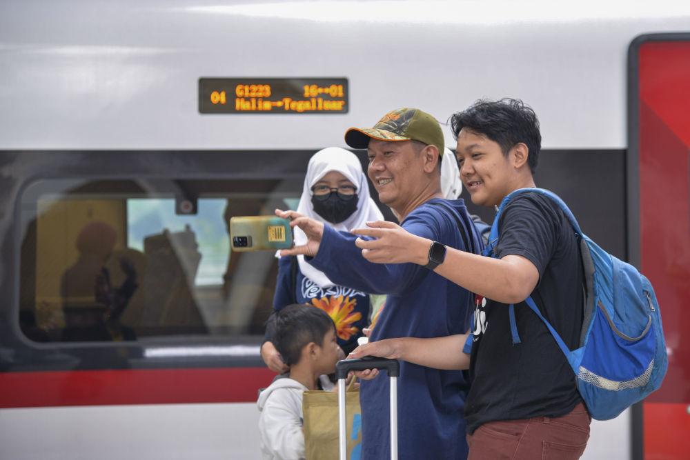 2023年12月25日,乘客在印度尼西亞雅加達(dá)的哈利姆車站站臺與雅萬高鐵高速動車組合影。截至12月24日,作為中印尼共建“一帶一路”合作的“金字招牌”,雅萬高鐵累計發(fā)送旅客突破100萬人次。