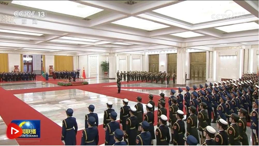 穆伊茲在習(xí)近平陪同下檢閱中國人民解放軍儀仗隊。