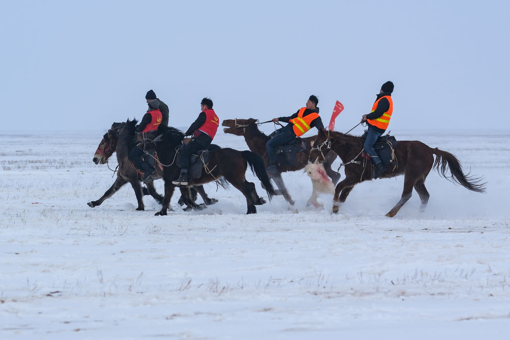 2023年12月21日,牧民在“冬宰節(jié)”上表演叼羊。