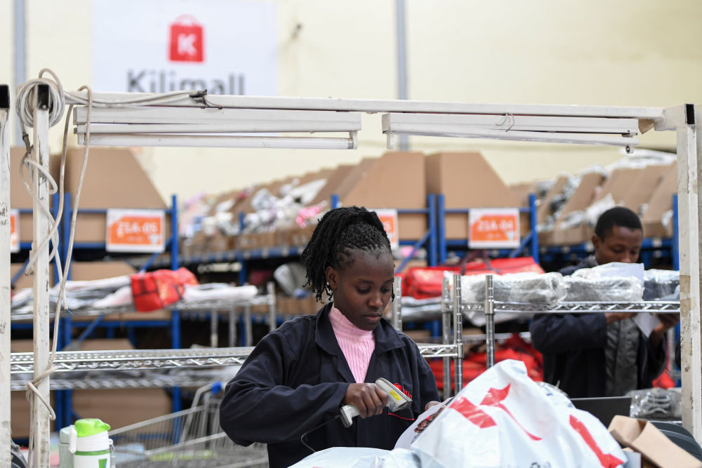 2023年7月28日,在肯尼亞姆洛隆戈,湖南長(zhǎng)沙非拓信息技術(shù)有限公司旗下電商平臺(tái)Kilimall的員工在倉(cāng)庫(kù)內(nèi)分揀貨物。新華社記者 李亞輝 攝
