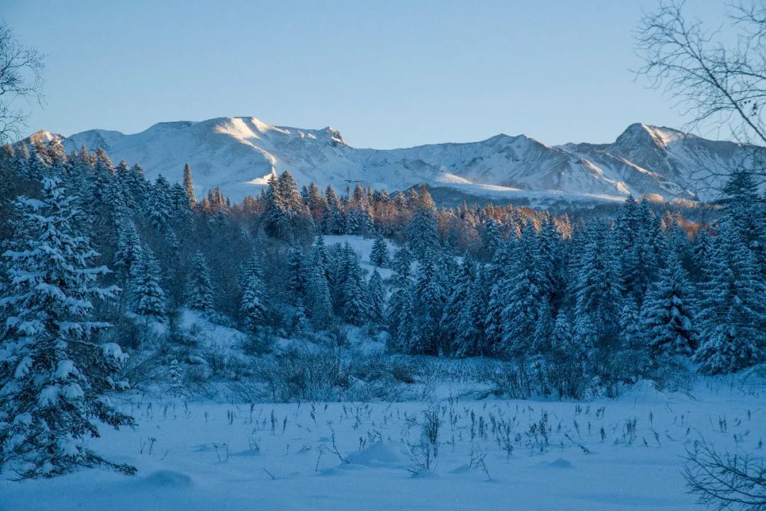 △2023年12月17日,吉林撫松縣松江河鎮(zhèn),長白山西坡為大雪覆蓋,景色如畫。