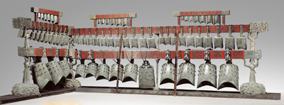 曾侯乙編鐘。1978年出土于湖北隨縣(今隨州市)曾侯乙墓,戰(zhàn)國時期青銅樂器的巔峰之作,編鐘的鐘體、鐘架和掛鐘構件上共有3755字銘文,包含了豐富的樂律學知識。