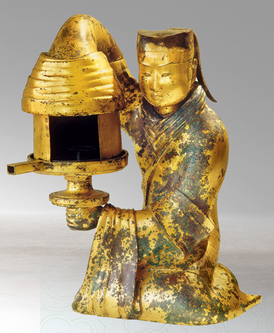 長信宮燈。1968年出土于河北保定滿城漢墓,形狀為跪地執(zhí)燈的宮女,通體鎏金。燈盤可轉動,以調(diào)節(jié)燈光亮度和照射方向,燈身人物中空的衣袖和身體作為通道用于排煙。