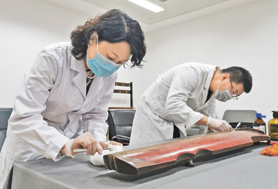 遼寧省博物館工作人員在對九霄環(huán)佩琴進行保養(yǎng)。九霄環(huán)佩琴制作于唐代。在古琴琴底,鐫刻著“九霄環(huán)佩”四個字。琴面上,鑲嵌著13個由蚌殼制成的圓點,起到標記琴弦音位的作用。