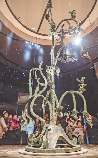 四川廣漢三星堆博物館內(nèi),觀眾圍在Ⅰ號大型銅神樹前仔細觀看。Ⅰ號大型銅神樹由底座、樹和龍三部分組成,體現(xiàn)了高超的冶鑄技術和藝術水平。