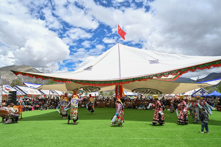 民間藏戲表演隊(duì)在西藏南木林縣非遺公園內(nèi)表演湘巴藏戲(2025年7月16日攝)。新華社記者 李鑫 攝