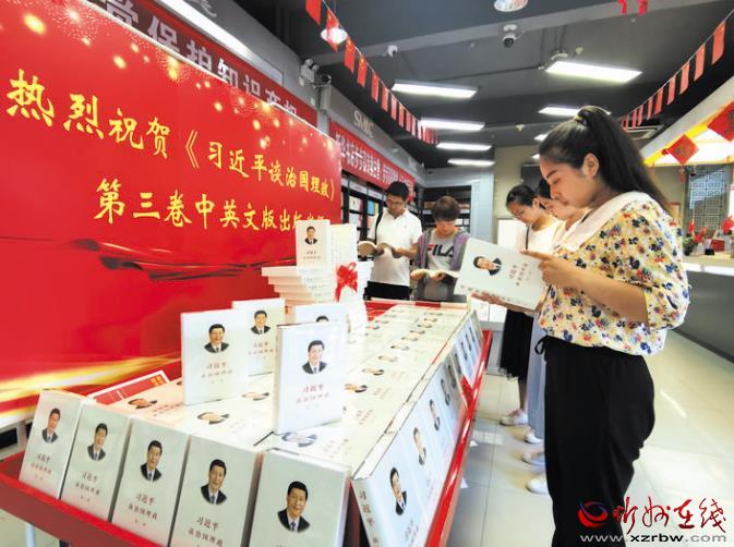 8月7日,在忻州市新華書店,讀者正在翻閱新發(fā)行的《習(xí)近平談治國(guó)理政》第三卷。該書自出版發(fā)行以來(lái),忻州市新華書店第一時(shí)間設(shè)立專架,重點(diǎn)展示銷售。同時(shí),書店還采取多種形式,積極組織力量深入社區(qū)、農(nóng)村、黨政機(jī)關(guān)、企事業(yè)單位、大專院校、部隊(duì)開展宣傳征訂工作,保證廣大黨員干部群眾能夠及時(shí)購(gòu)買閱讀到《習(xí)近平談治國(guó)理政》第三卷。 張存良 攝