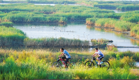 初夏,漫步鹽湖七彩步道,或見(jiàn)市民慢跑騎行、健身鍛煉,或見(jiàn)游客觀水賞景。芳草萋萋、水鳥(niǎo)頻現(xiàn)的鹽湖正成為市民擁抱自然的詩(shī)意棲息地。