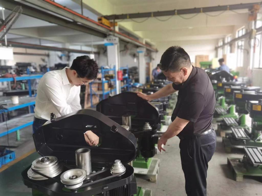 受疫情影響,2021年外貿(mào)企業(yè)訂單量隨著海運(yùn)放緩、海外需求下降而減少。生產(chǎn)閑下來(lái)了,但繆繼云和兒子繆帥濤對(duì)產(chǎn)品改良的思考沒(méi)有停止。在不斷調(diào)試臺(tái)鉆時(shí),他們發(fā)現(xiàn),調(diào)速必須動(dòng)手換皮帶,“為什么不能像調(diào)收音機(jī)一樣調(diào)動(dòng)速率呢?”兩人一商量,立即開始畫草圖,接著去銀行貸款投入模具開發(fā)。