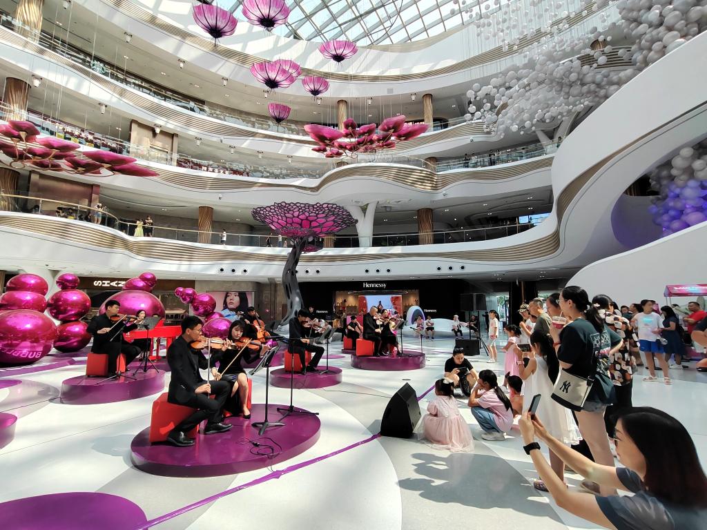 端午假期,海口國際免稅城內(nèi),伴隨著悠揚的音樂,陽光傾瀉“天際秘林”夢幻舞臺,正在購物的游客們紛紛駐足欣賞?!耙粓鍪覂?nèi)音樂會,給購物消費增添了新意和氛圍感?!焙?谑忻耜惱俪两陉柟夂鸵魳分小?/p>