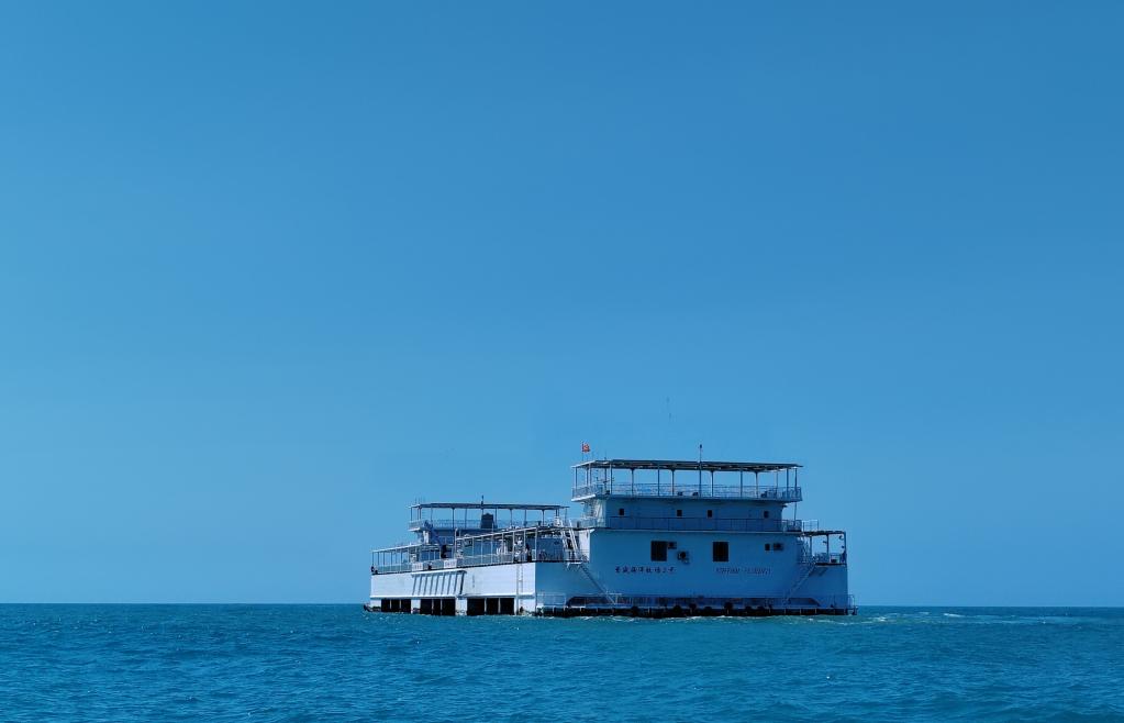 從海南省樂東黎族自治縣龍棲灣向外約8海里,可以看到“普盛海洋牧場(chǎng)3號(hào)”如同一艘白色郵輪泊在蔚藍(lán)色的大海之中。