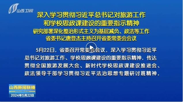 山西日?qǐng)?bào)報(bào)道 5月22日,省委召開常委會(huì)會(huì)議,深入學(xué)習(xí)貫徹習(xí)近平總書記對(duì)旅游工作、學(xué)校思政課建設(shè)的重要指示精神,傳達(dá)貫徹全國(guó)旅游發(fā)展大會(huì)、新時(shí)代學(xué)校思政課建設(shè)推進(jìn)會(huì)、政法領(lǐng)導(dǎo)干部學(xué)習(xí)貫徹習(xí)近平法治思想專題研討班精神,研究部署深化整治形式主義為基層減負(fù)工作。省委書記唐登杰主持會(huì)議。