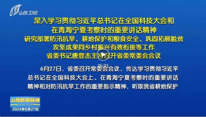 山西日報(bào)報(bào)道6月27日,省委召開常委會(huì)會(huì)議,傳達(dá)學(xué)習(xí)貫徹習(xí)近平總書記在全國科技大會(huì)上、在青海寧夏考察時(shí)的重要講話精神和對(duì)防汛抗旱工作的重要指示精神,聽取我省耕地保護(hù)和糧食安全責(zé)任制工作落實(shí)、2023年度市縣黨委和政府鞏固拓展脫貧攻堅(jiān)成果同鄉(xiāng)村振興有效銜接考核情況匯報(bào),審議通過《山西省2023年度國家鞏固拓展脫貧攻堅(jiān)成果同鄉(xiāng)村振興有效銜接考核評(píng)估反饋問題整改工作方案》。省委書記唐登杰主持會(huì)議。
