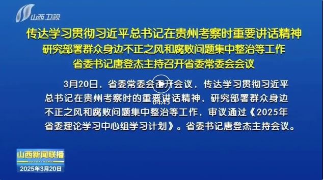 山西日?qǐng)?bào)報(bào)道 3月20日,省委常委會(huì)召開會(huì)議,傳達(dá)學(xué)習(xí)貫徹習(xí)近平總書記在貴州考察時(shí)的重要講話精神,研究部署群眾身邊不正之風(fēng)和腐敗問題集中整治等工作,審議通過《2025年省委理論學(xué)習(xí)中心組學(xué)習(xí)計(jì)劃》。省委書記唐登杰主持會(huì)議。