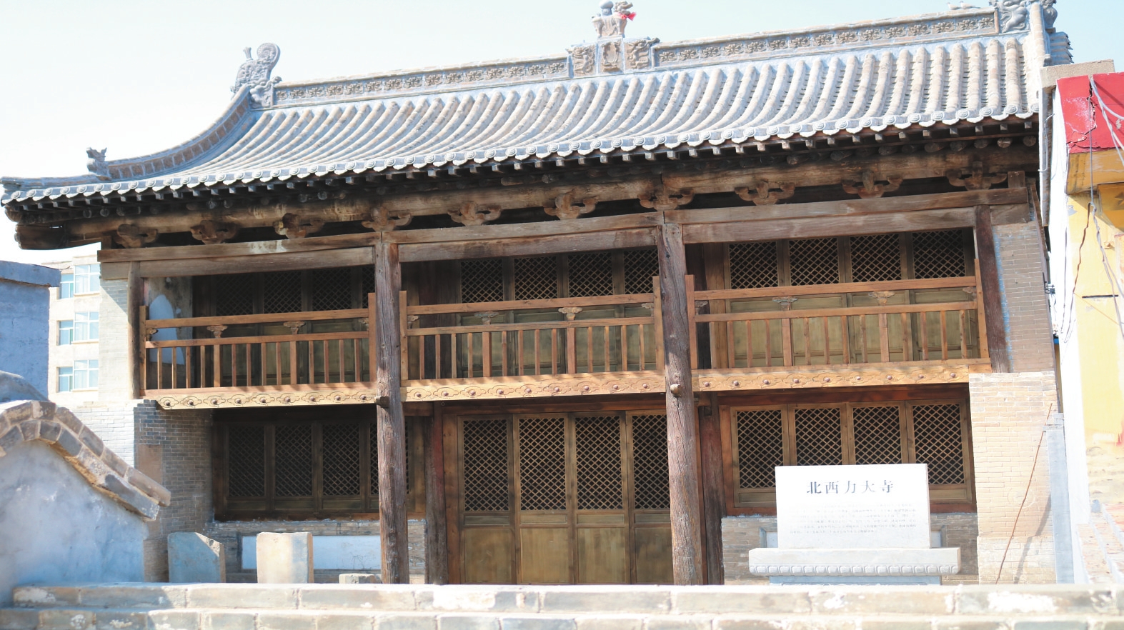 北西力大寺位于定襄縣晉昌鎮(zhèn)北西力村中,坐北朝南,東西長11.1米、南北寬8.4米,占地面積約93平方米。據(jù)梁架題記記載為明萬歷四十三年(1615)所建。該寺沿中軸線原建有山門、過廳、正殿,兩側(cè)建有東西配房。現(xiàn)僅存正殿,為二層樓閣式結構,面寬三間,進深四椽,前設廊,單檐懸山頂,五檁架結構。二層廊前兩側(cè)有人物壁畫約4平方米。2015年8月25日公布為市級文物保護單位。