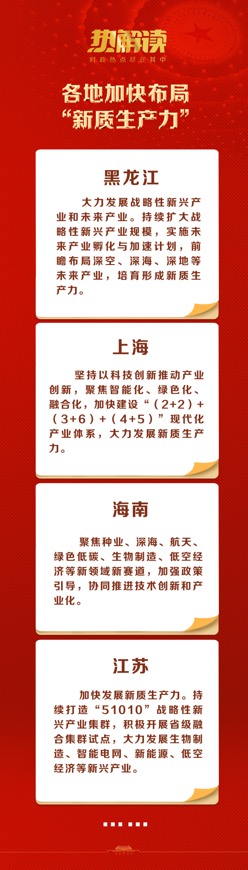 從2023年底召開的中央經(jīng)濟工作會議要求發(fā)展新質(zhì)生產(chǎn)力,到今年中央政治局首次集體學習時聚焦“新質(zhì)生產(chǎn)力”,再到今年政府工作報告將加快發(fā)展新質(zhì)生產(chǎn)力列為2024年十大工作任務(wù)之首,一系列重要安排部署釋放出鮮明信號,即發(fā)展新質(zhì)生產(chǎn)力重要且迫切。 從經(jīng)濟學角度看,新質(zhì)生產(chǎn)力區(qū)別于依靠大量資源投入、高度消耗資源能源的發(fā)展方式,代表了一種生產(chǎn)力的躍遷。這是否意味著要迅速以“新”換“舊”,放棄傳統(tǒng)產(chǎn)業(yè)? “先立后破”是總書記這次在江蘇代表團給出的答案。總書記說,發(fā)展新質(zhì)生產(chǎn)力不是忽視、放棄傳統(tǒng)產(chǎn)業(yè)。 在發(fā)展新質(zhì)生產(chǎn)力過程中,應(yīng)在“立”和“破”上把握好先后順序,兼顧當前與長遠,先立后破,避免“未立先破”或“只破不立”。 2023年12月,“先立后破”的提法出現(xiàn)在中央經(jīng)濟工作會議的決策部署上??梢?,“先立后破”已成為解決當代中國艱巨繁重改革發(fā)展穩(wěn)定問題的重要方法論。 2022年全國兩會上,總書記在談到如何推進實現(xiàn)“雙碳”目標時曾形象打過一個比方——“不能把手里吃飯的家伙先扔了,結(jié)果新的吃飯家伙還沒拿到手,這不行”,說的就是“先立后破”的道理。 再看因地制宜。 加快發(fā)展新質(zhì)生產(chǎn)力已成為2024年推進經(jīng)濟社會高質(zhì)量發(fā)展的主旋律。各地搶抓機遇,紛紛布局。在各省區(qū)市2024年政府工作報告中,多地將加快培育新質(zhì)生產(chǎn)力列為重點工作任務(wù)。