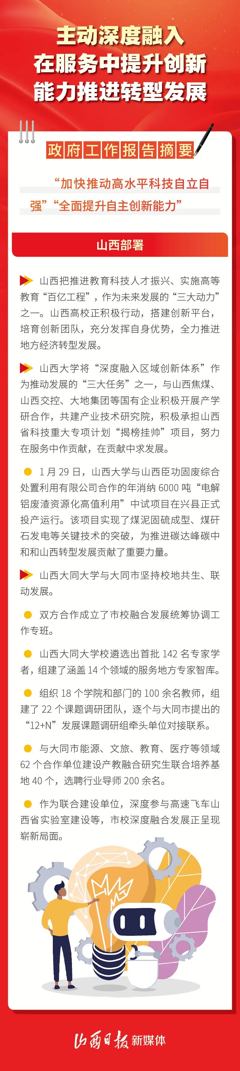 今年政府工作報告指出,堅持教育強國、科技強國、人才強國建設一體統(tǒng)籌推進,創(chuàng)新鏈產(chǎn)業(yè)鏈資金鏈人才鏈一體部署實施。這為山西高校更好地服務全省各地轉型發(fā)展、高質(zhì)量發(fā)展提供了遵循。