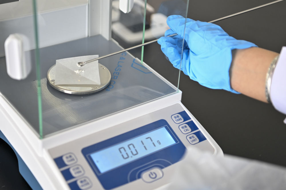 4月16日,在云岡研究院石質文物保護研究室,工作人員張帆為石窟壁面樣本稱重。云岡石窟現(xiàn)存主要洞窟45個