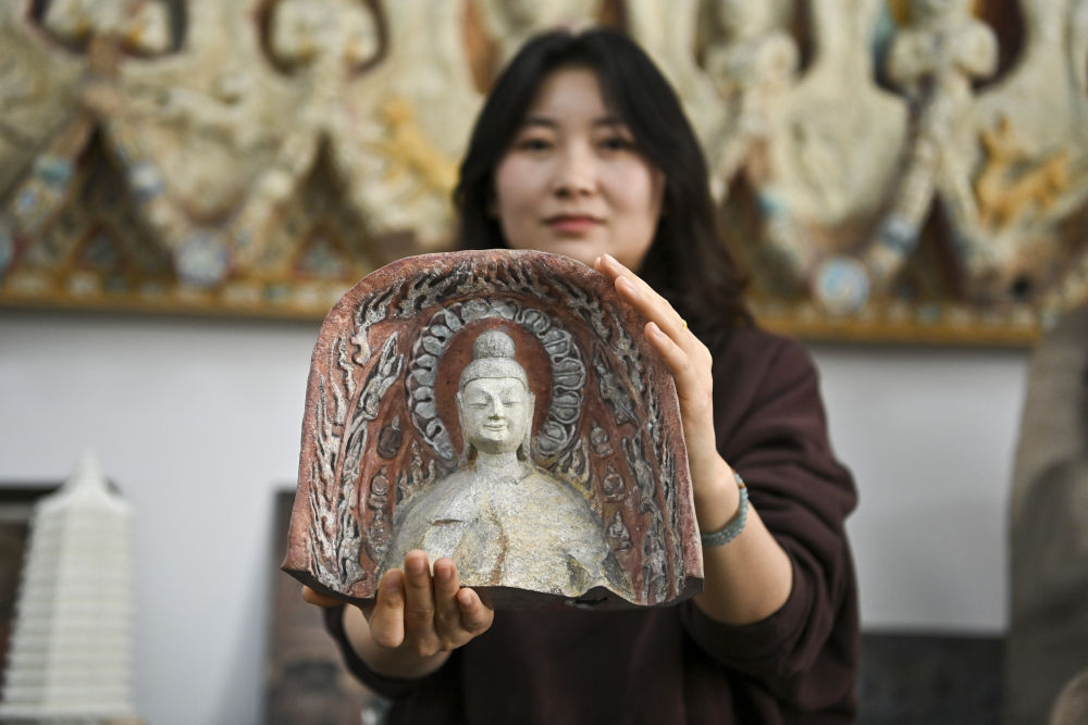 4月16日,在云岡研究院數(shù)字化保護中心展廳,工作人員王娜展示一款3D打印佛像模型。