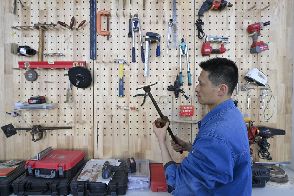 4月15日,在云岡研究院可移動文物修復室,工作人員孫麗娜在進行鐵器修復。
