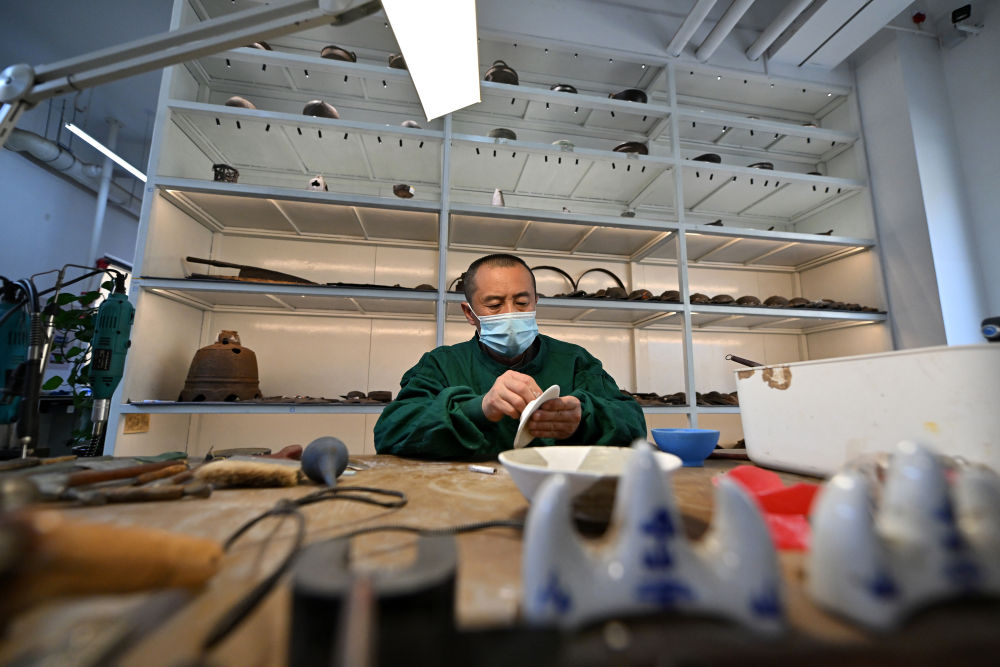 4月15日,在云岡研究院可移動文物修復室,工作人員劉銓義在進行瓷器修復。