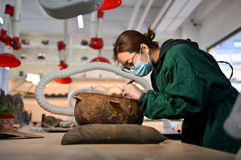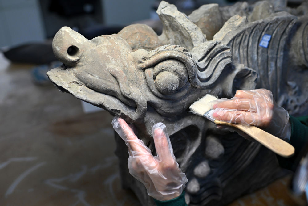4月15日,在云岡研究院可移動文物修復室,工作人員在進行除塵作業(yè)。