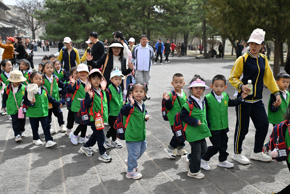 4月16日,在云岡石窟,小朋友在老師的帶領下參觀。