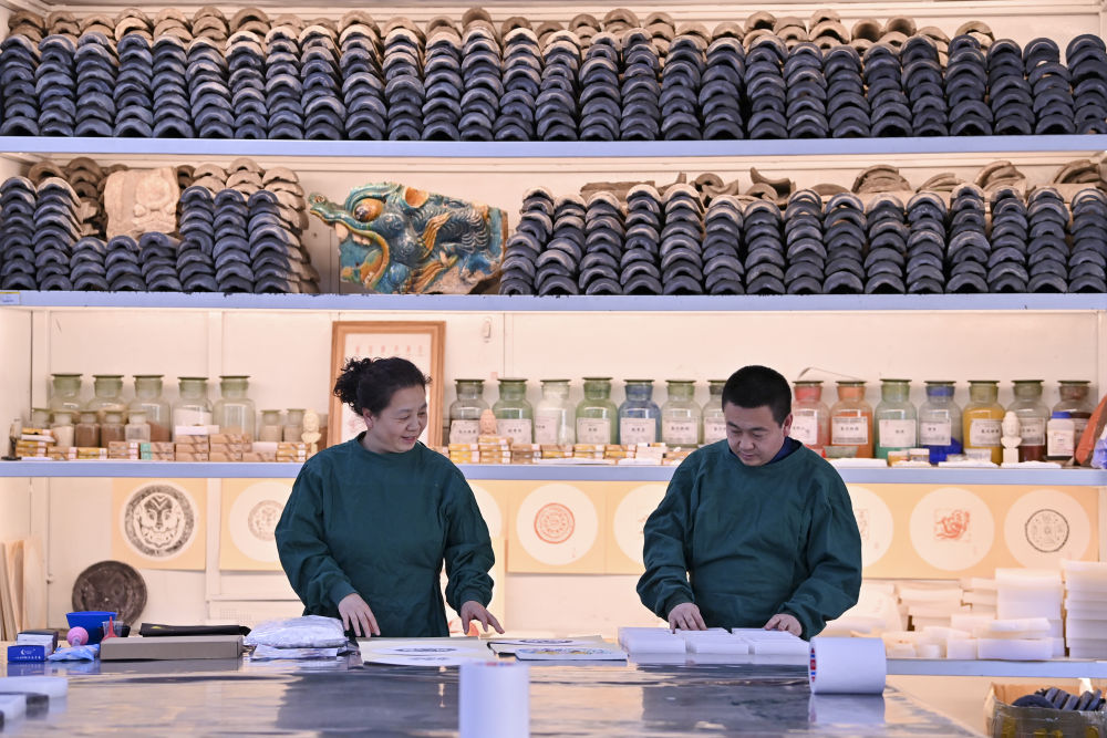 4月15日,在云岡研究院可移動文物修復室,工作人員安永芳(左)和魏松林為接下來的研學活動準備相關用品。