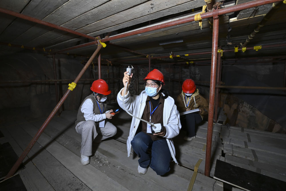 4月15日,來自中國石窟文化聯(lián)合研究生院的山西大學博士生楊亞娟(中)團隊在云岡石窟進行石窟氣溶膠單顆粒采樣。