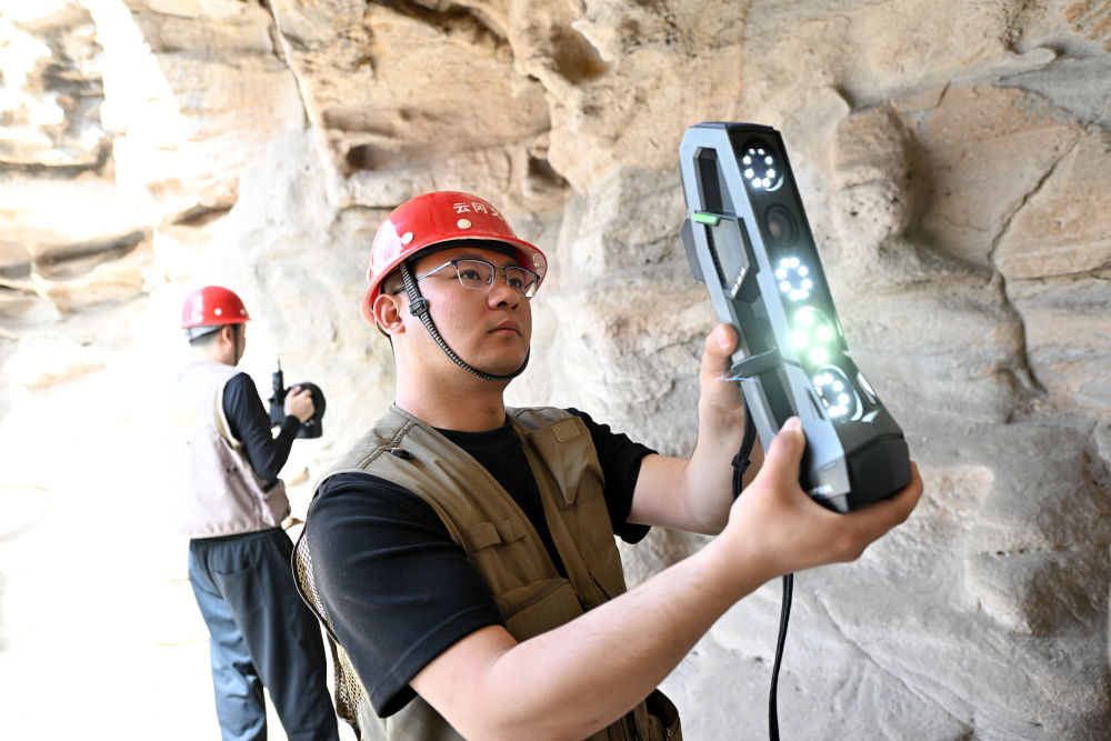 4月16日,云岡研究院數(shù)字化保護中心工作人員王超(左)在云岡石窟進行數(shù)字化信息采集。