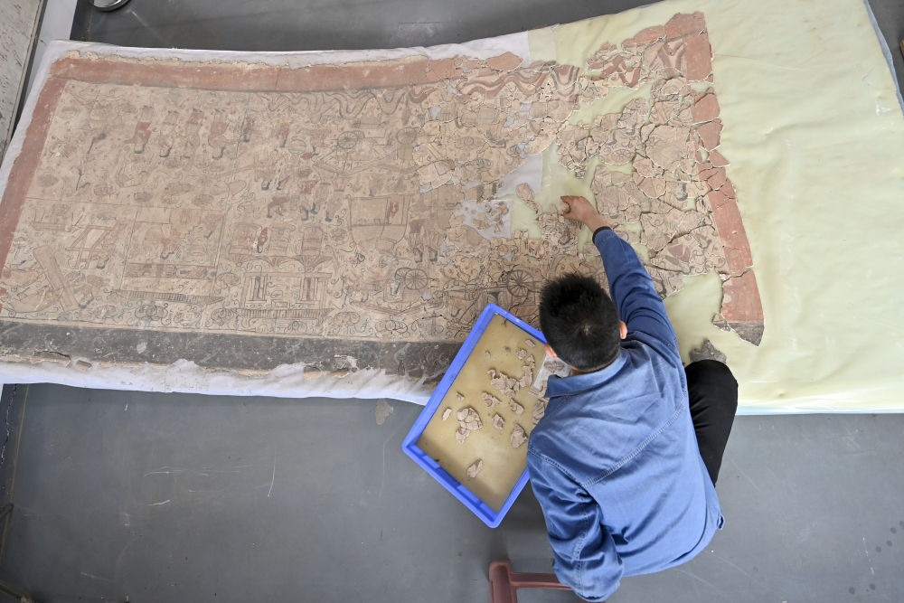 4月15日,在云岡研究院壁畫文物修復室,工作人員戴宇翔在修復壁畫。
