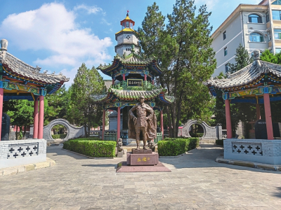 穿過大門,一座約3米高的古銅色左權(quán)將軍塑像巍然屹立。將軍身披軍大衣,目光堅定地望向遠(yuǎn)方,仿佛仍在守護這片曾經(jīng)戰(zhàn)斗過的土地。塑像后方,蒼松翠柏掩映著亭臺廊廡,肅穆之感油然而生。