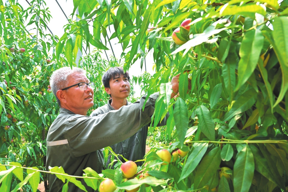 河曲縣榆嶺窊村技術(shù)人員觀察果樹長勢與掛果情況。 本報記者馮曉磊攝